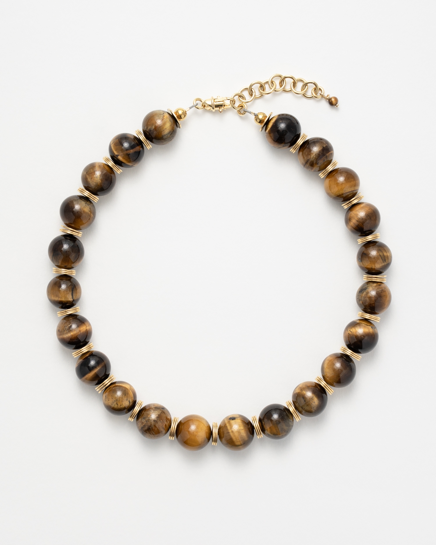 Le collier Olia Camel est composé de pierres précieuses oeil de tigre camel séparées par de petits anneaux dorés.