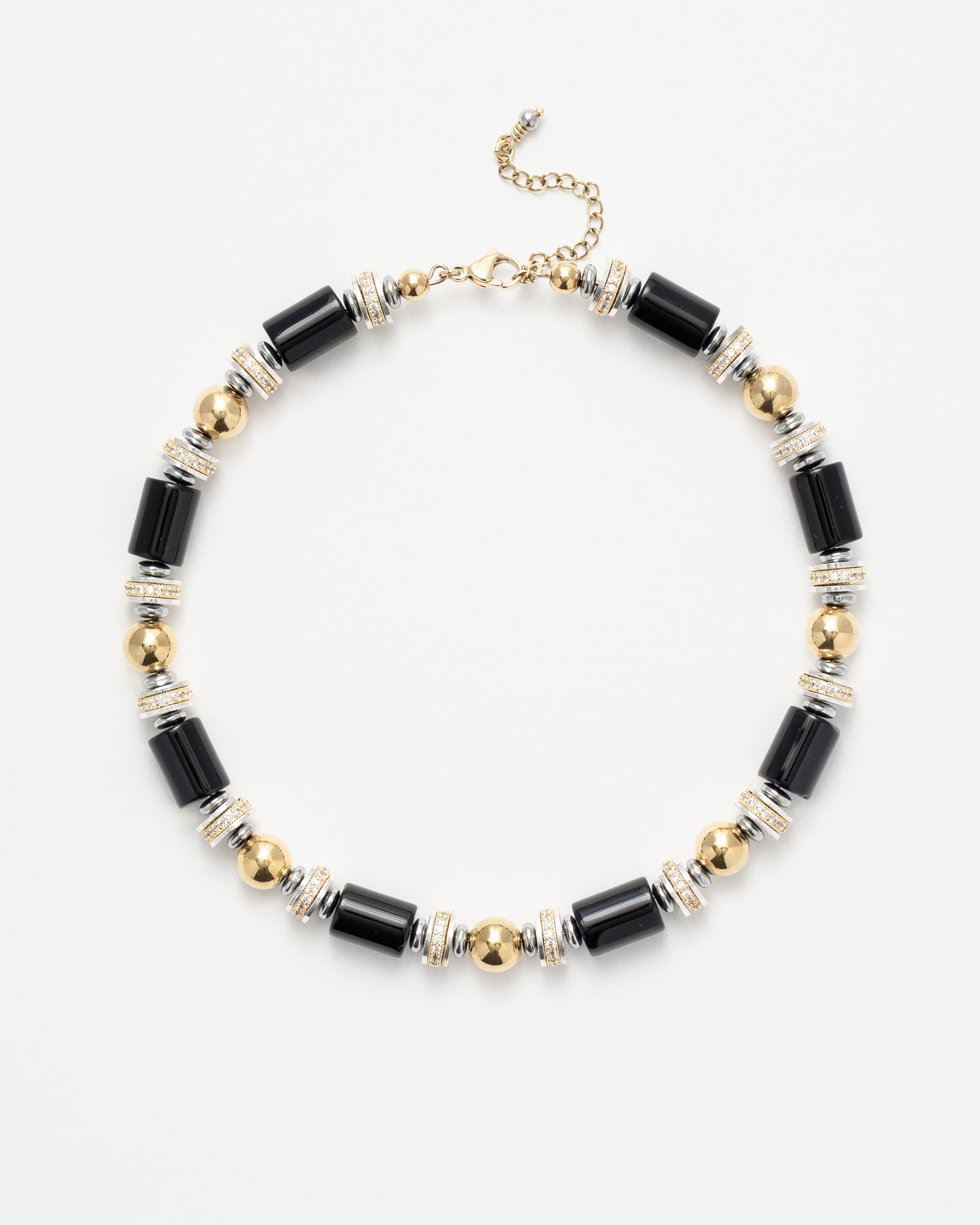 Le collier Athéna Black associe des perles cylindriques d’agate noire à des perles dorées et des anneaux argentés, rehaussés d’anneaux sertis de pierres claires.