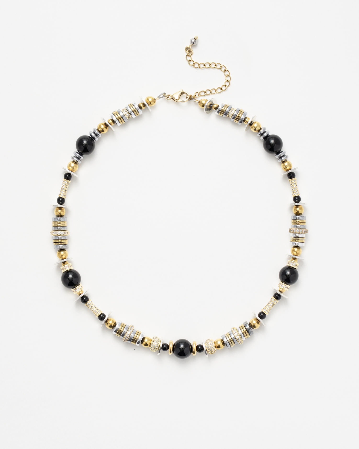 Le collier New Nefertiti Black associe des perles en pierres obsidiennes noires à des éléments dorés et argentés, ponctués d’anneaux sertis de pierres claires.