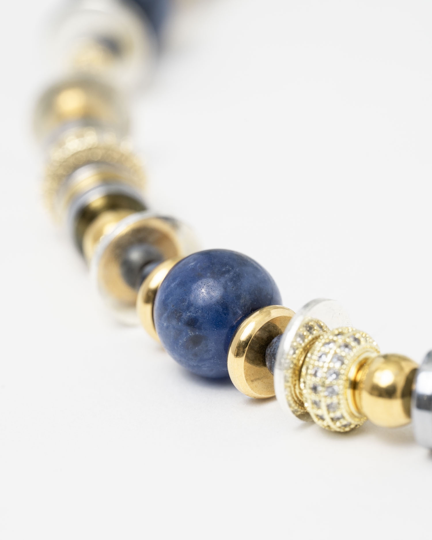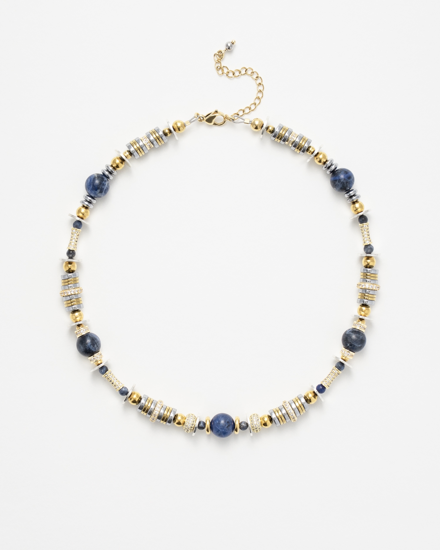 Le collier New Nefertiti Blue associe des perles en perles sodalite bleue à des éléments dorés et argentés, ponctués d’anneaux sertis de pierres claires.