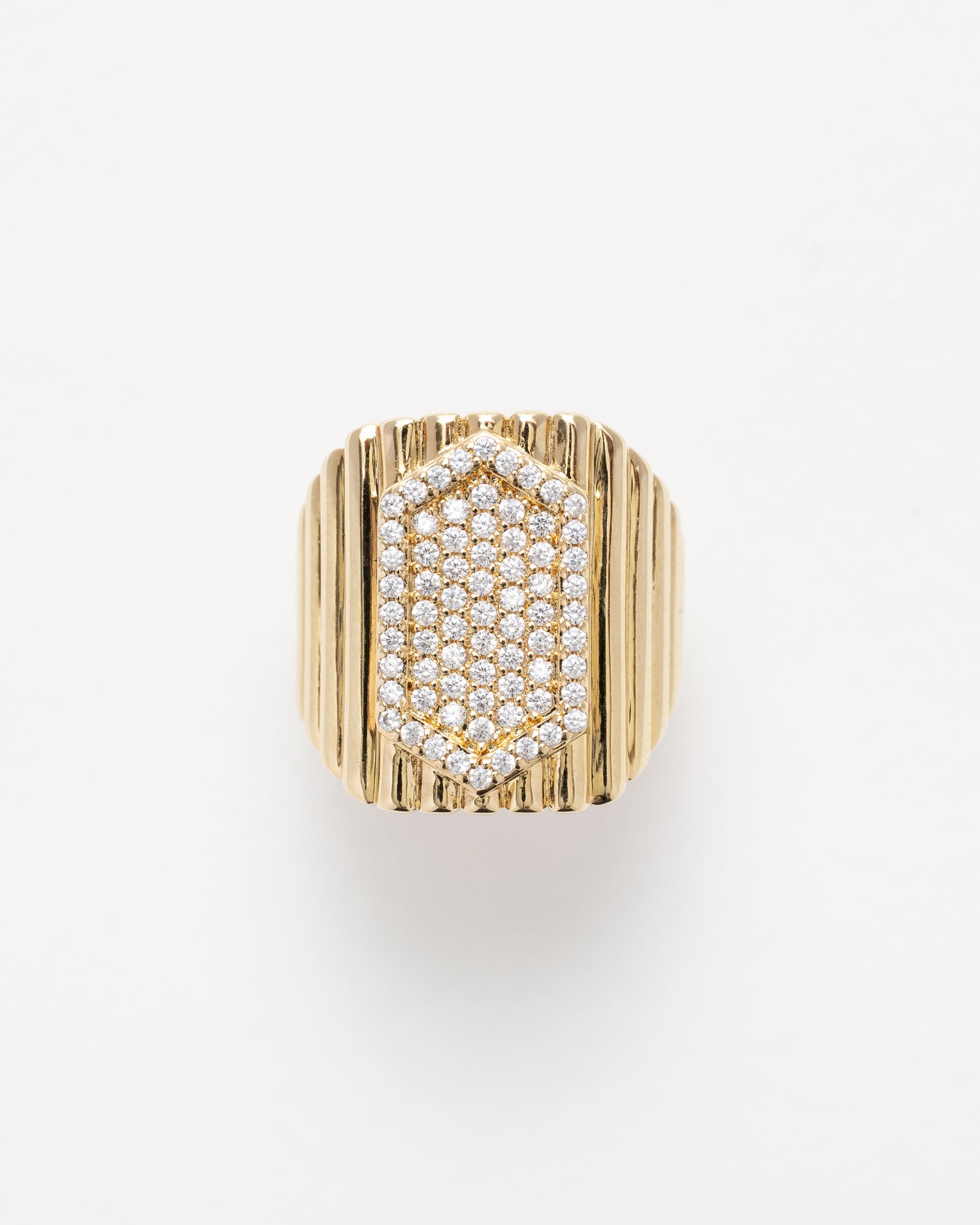La bague Dynasty Gold présente un anneau en plaqué or à finition striée verticale, orné d’un motif hexagonale pavé de petites pierres claires.