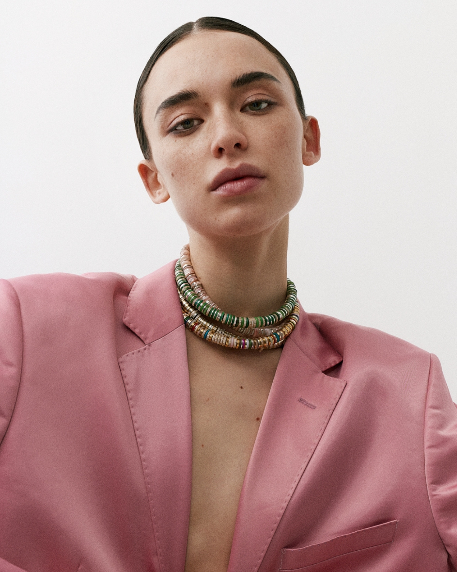 Collier réglable composé de perles plates Heishi vertes, de perles plates dorées, argentées et d'oxydes de zirconium sur une monture structurée.