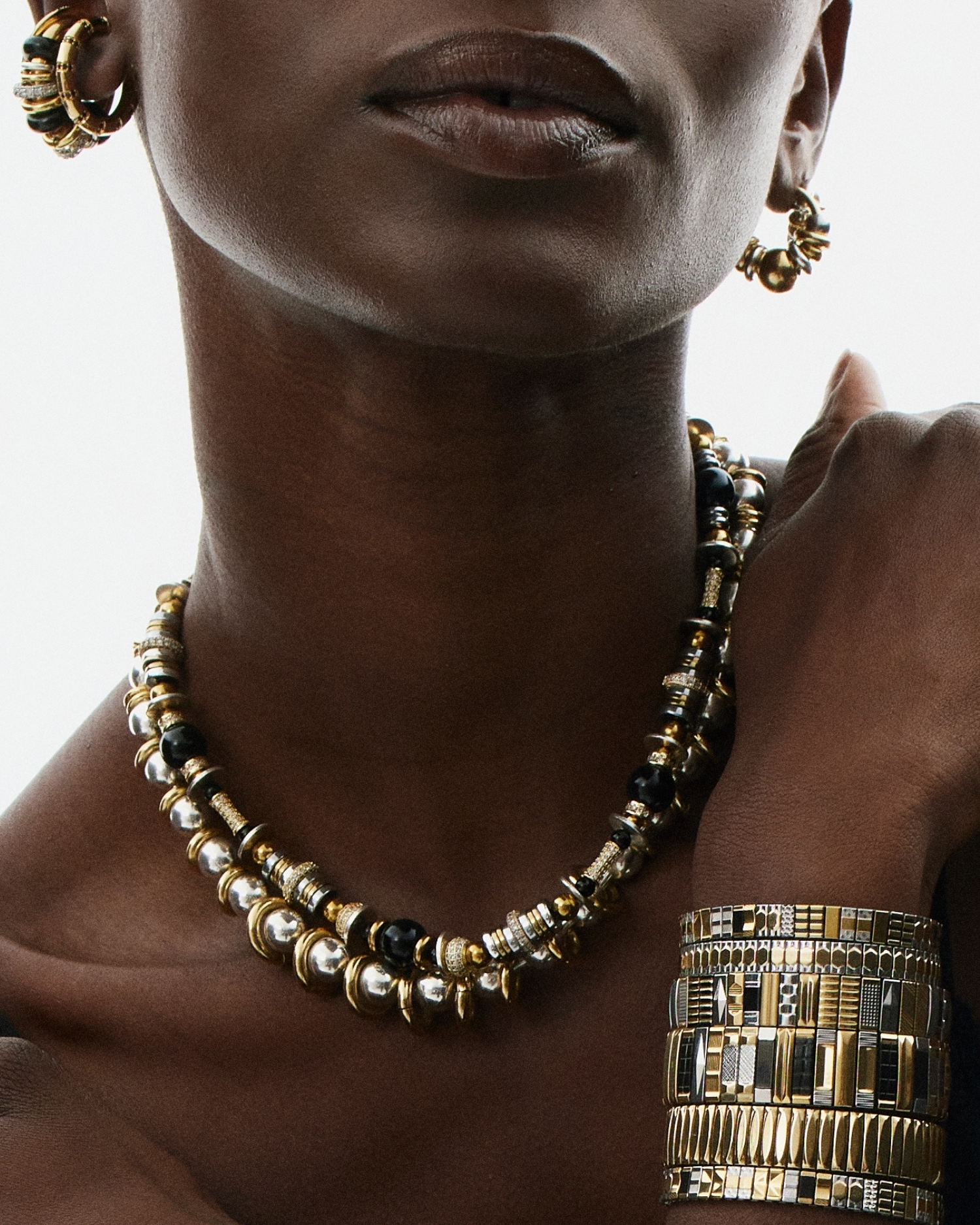 Collier souple et réglable, composé d'un mélange d'anneaux or et argent, d'oxydes de zirconium et de perles obsidiennes d'agate noire.