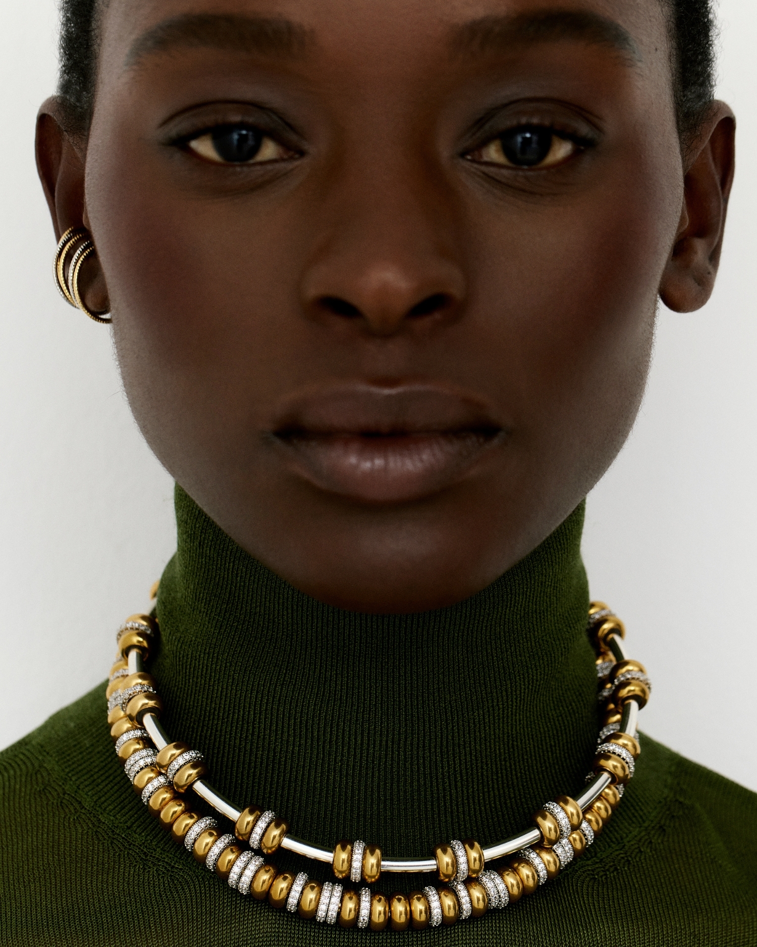 Torque doré orné de perles dorés et d'anneaux en oxyde de zirconium, réglable pour chaque taille de cou.