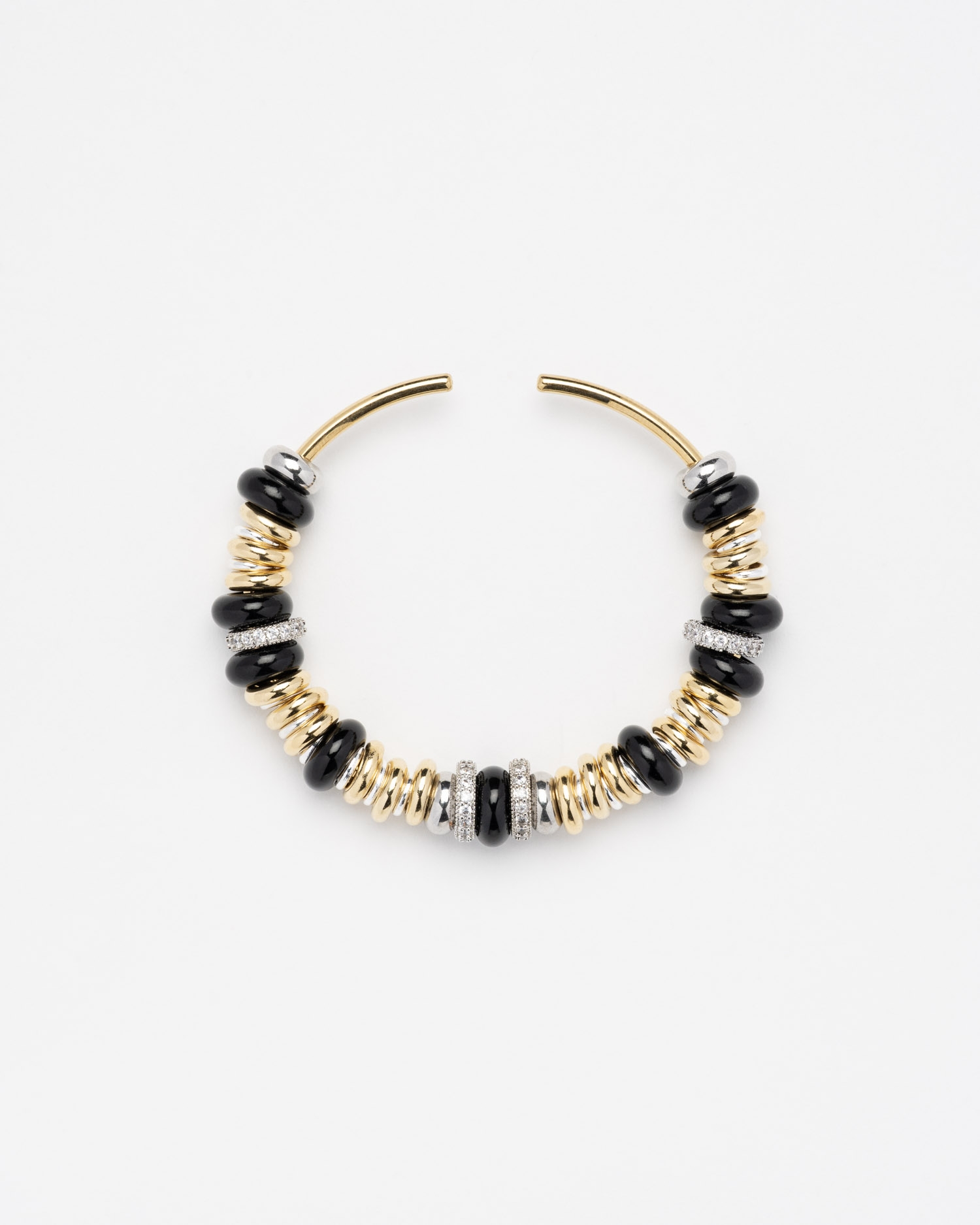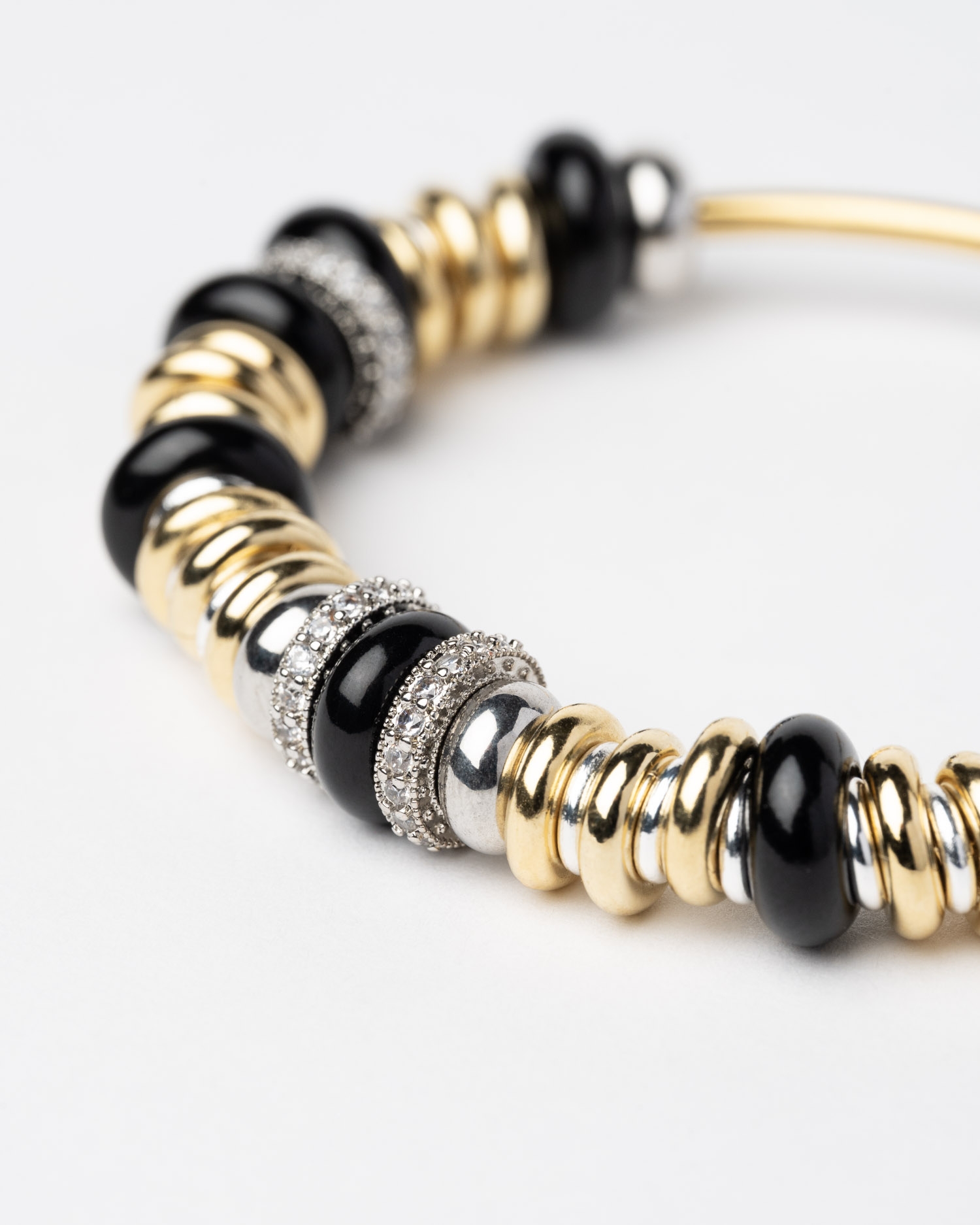 Bracelet jonc rigide en perles dorées et argentées avec oxydes de zirconium.