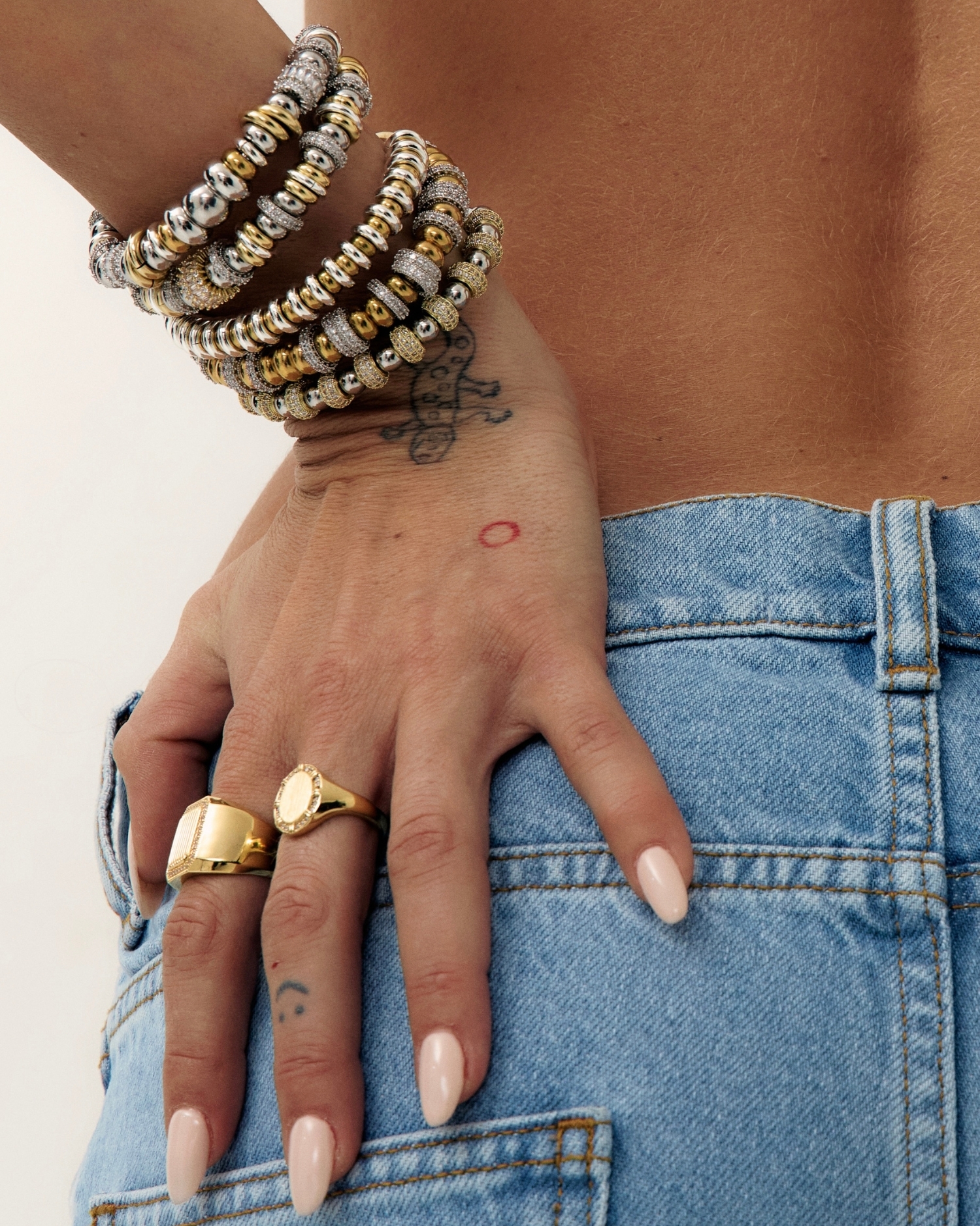 Bracelet jonc rigide en perles dorées, argentées et oxydes de zirconium.