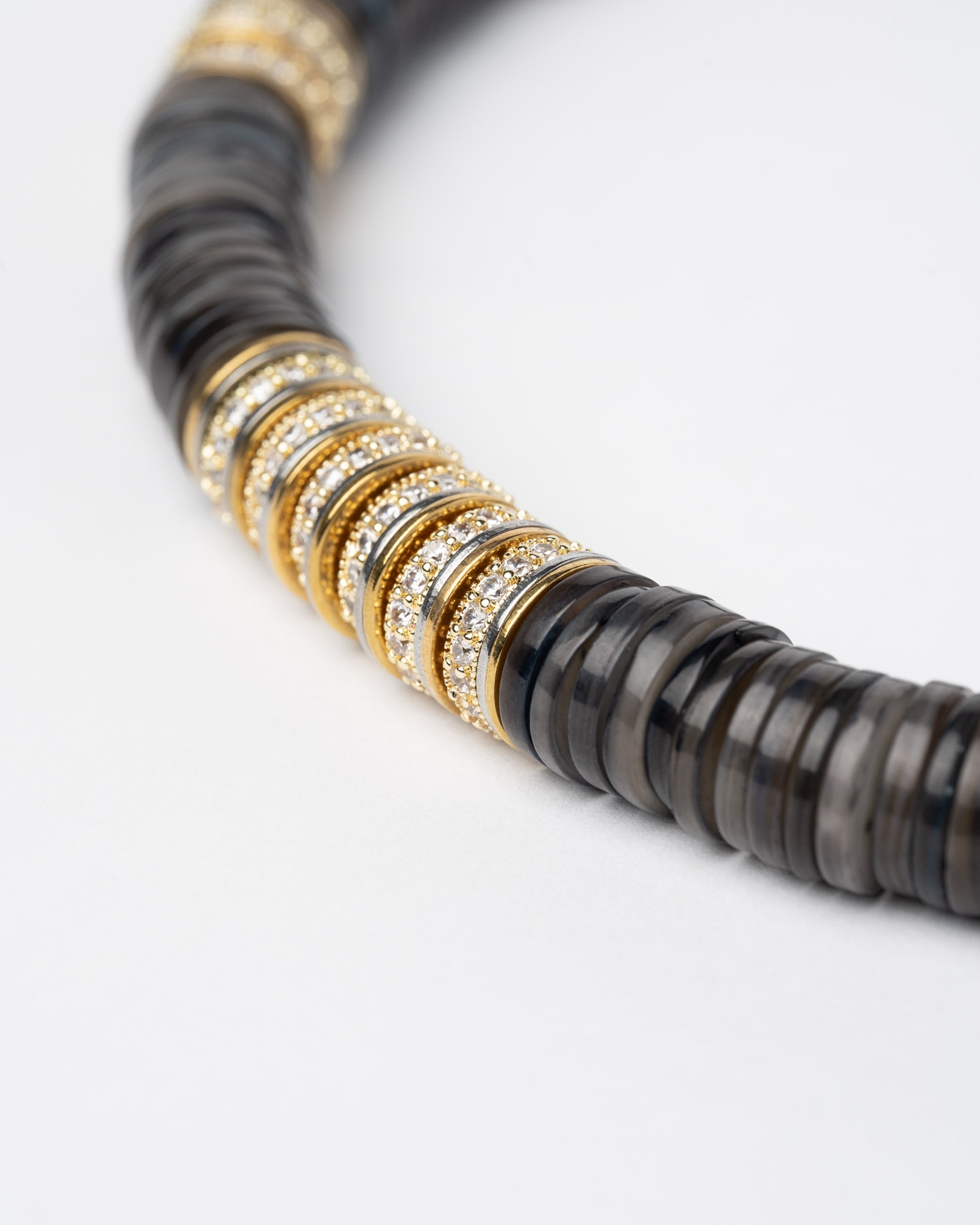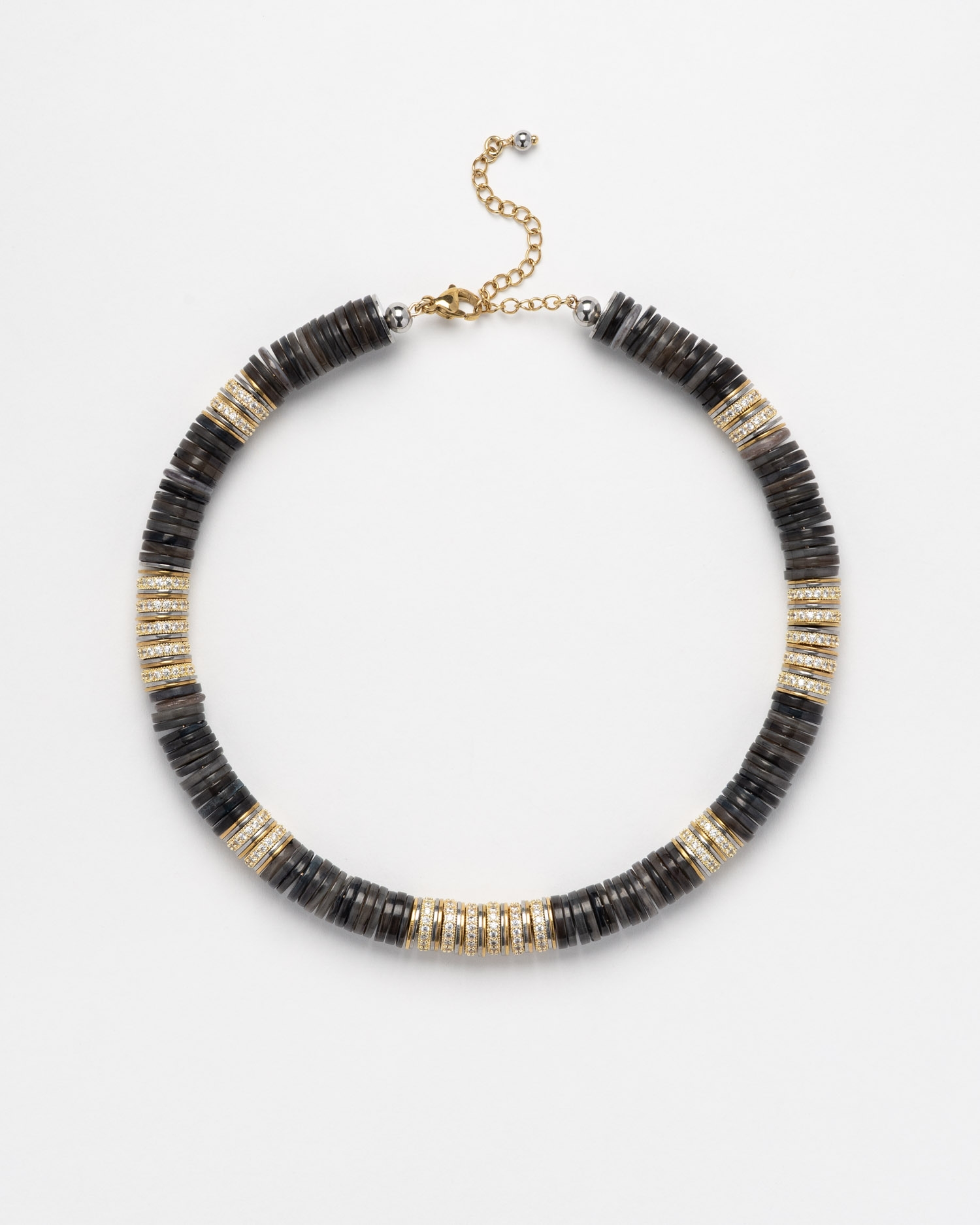 Collier réglable composé de perles plates Heishi noires, dorées et d'oxydes de zirconium sur une monture structurée.