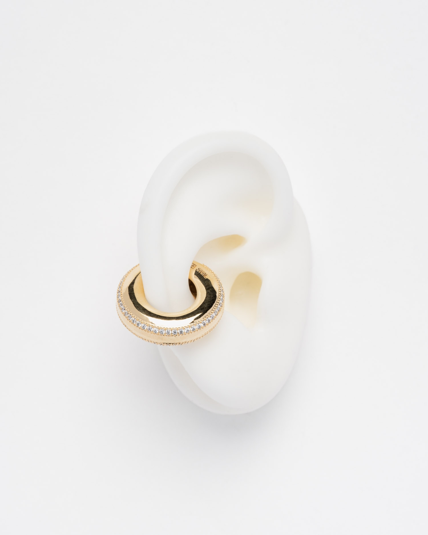 Anneau doré biface, brossé d'un coté et lisse de l'autre, orné de lignes d'oxydes de zirconium sertis.