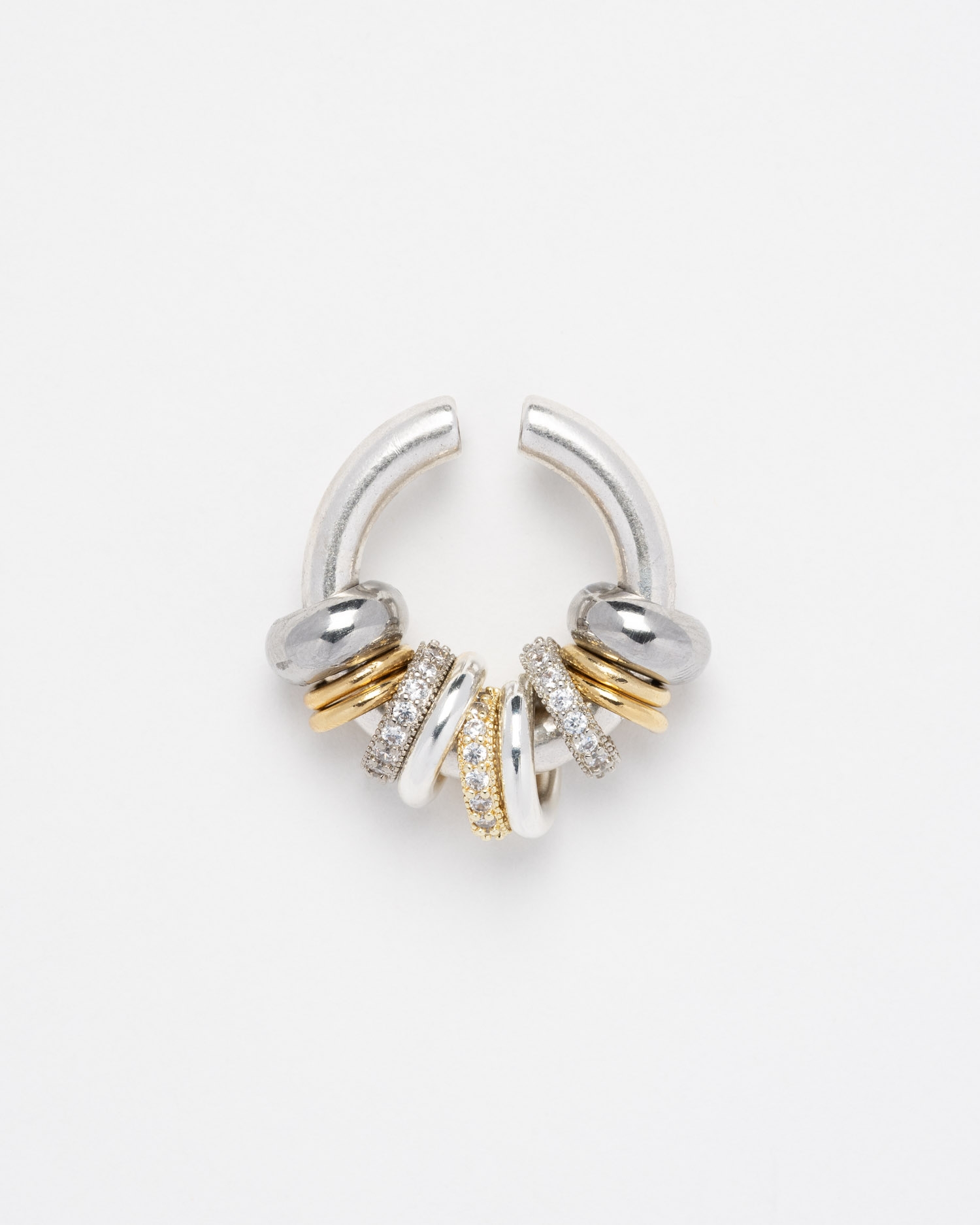 Anneau argenté composé d'une variété d'anneaux dorés, argentés, de perles argentées et d'oxydes de zirconium.