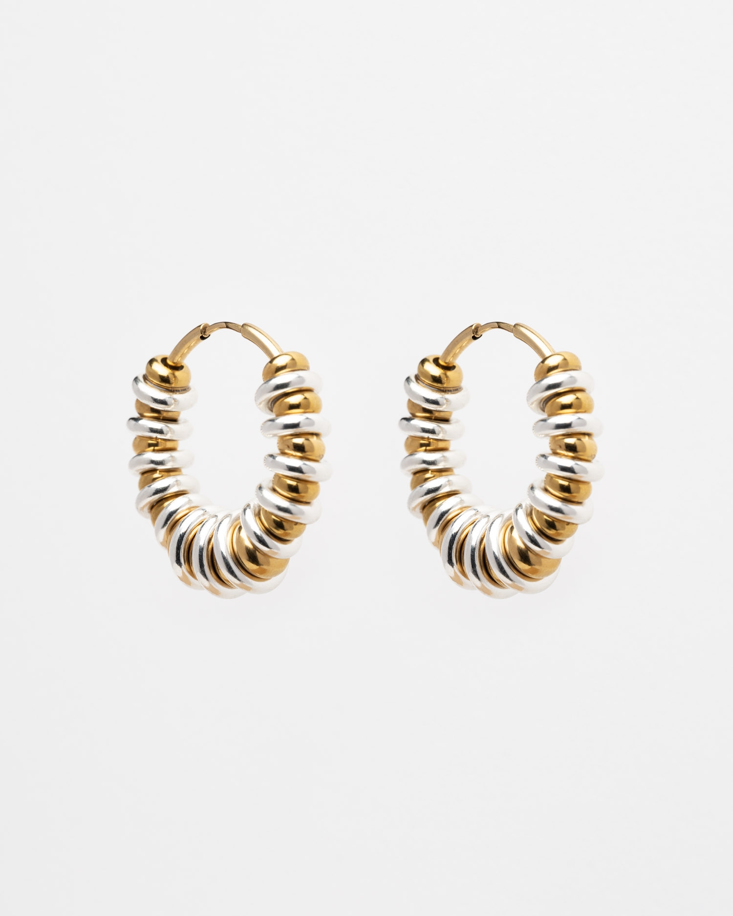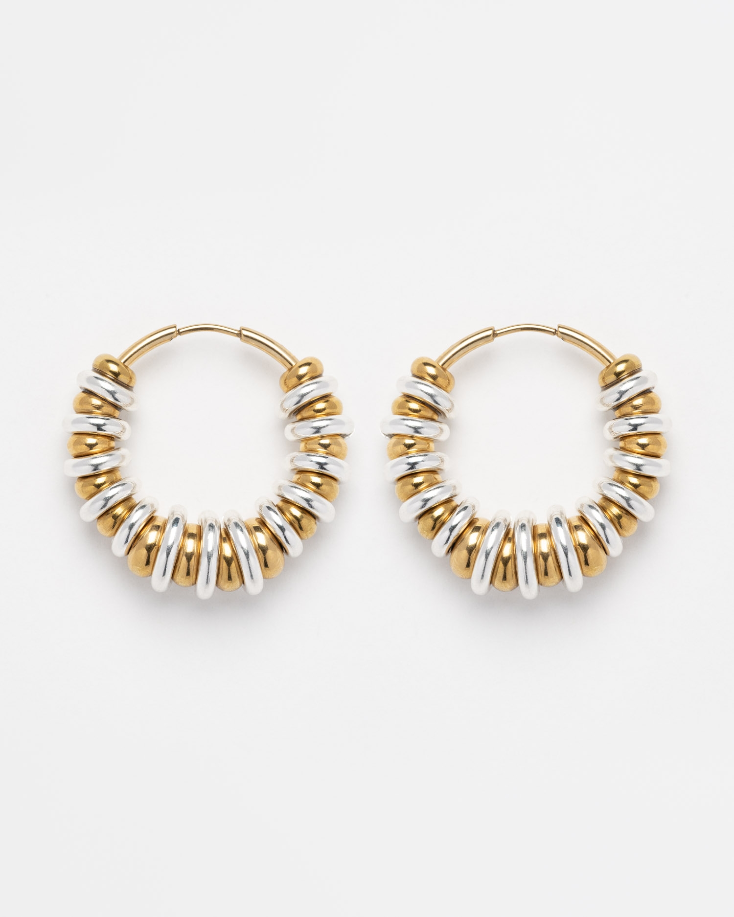 Grandes créoles dorées composées d'un alliage de perles dorées et d'anneaux argentés de différentes tailles.
