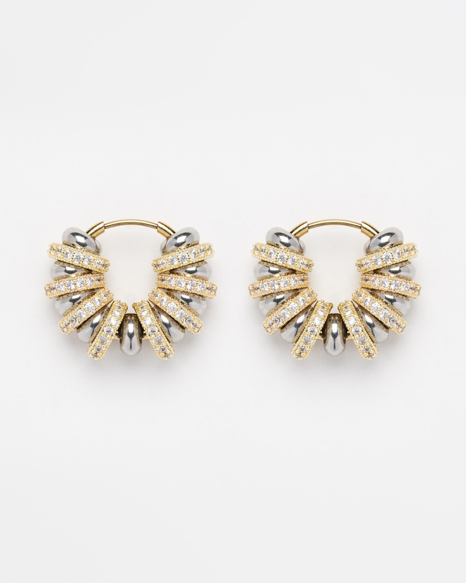 Créoles dorées composées d'un alliage de perles argentées et d'oxydes de zirconium.
