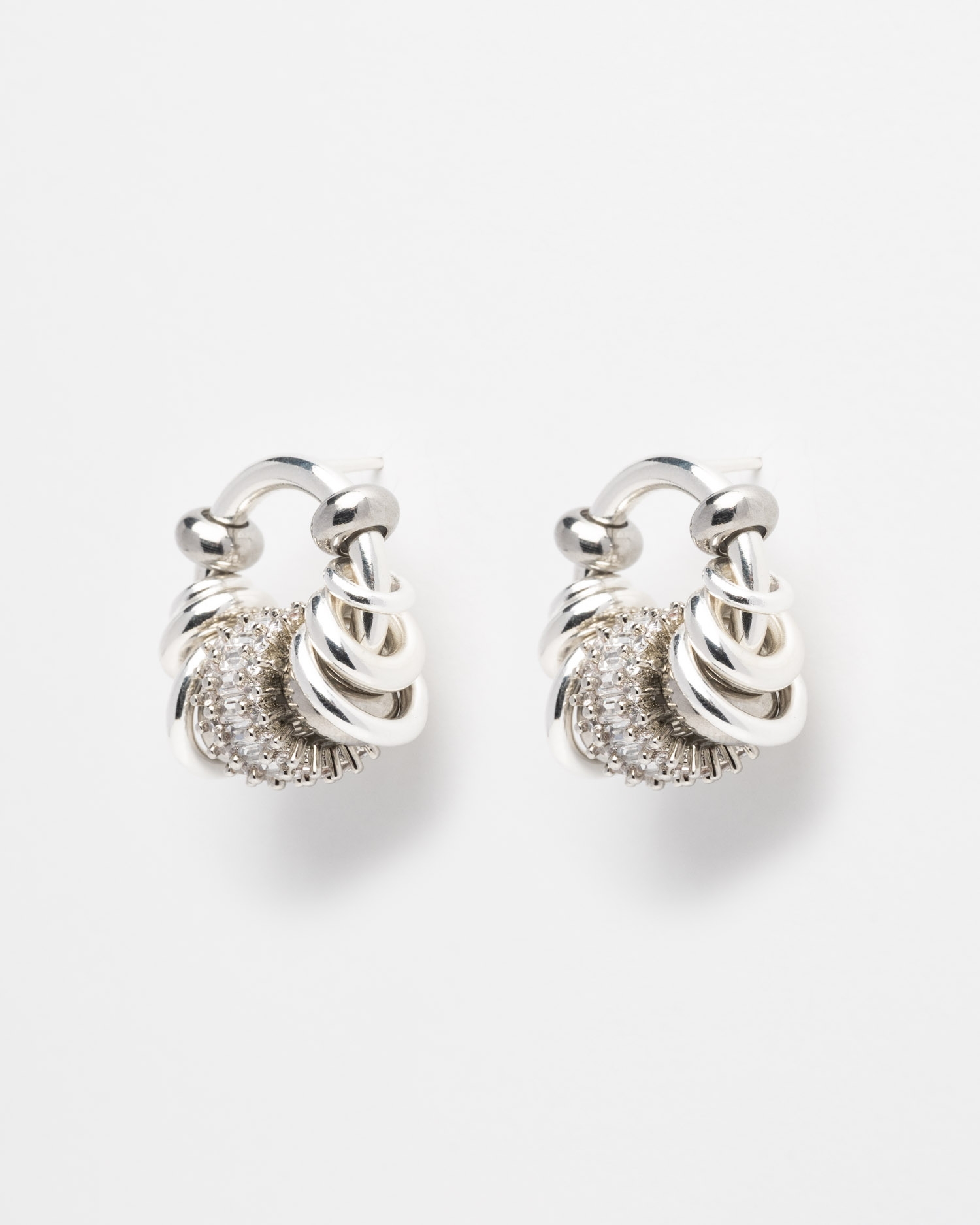 Boucles d'oreilles argentées ornées d'une perle d'oxyde de zirconium centrale, de perles argentées et d'une variété d'anneaux argentés.