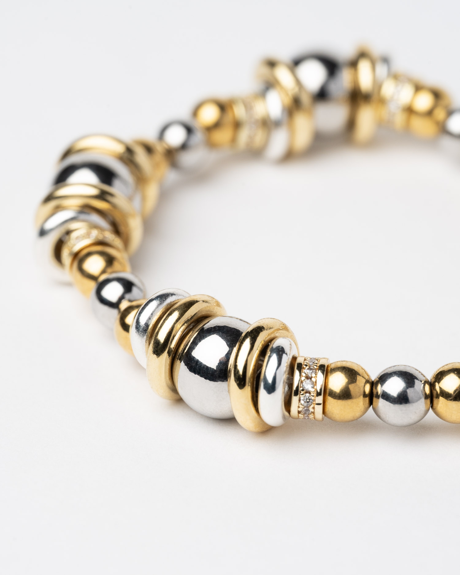 Bracelet jonc rigide en perles dorées et argentées avec oxydes de zirconium.